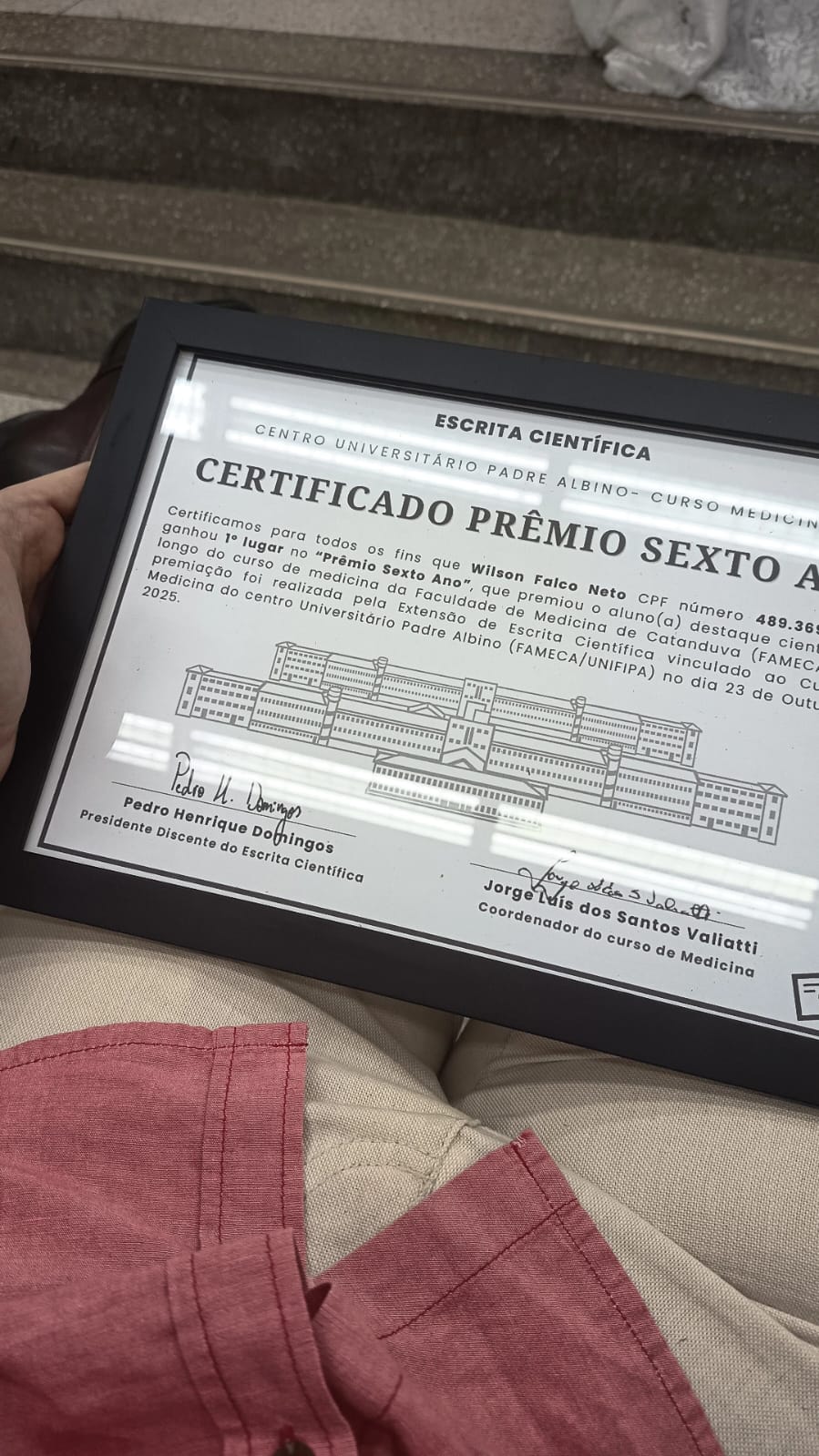 Aluno da Medicina UNIFIPA/FAMECA recebe reconhecimento do curso em premiação científica Luiz Felicio Chaves sexta, 14 de novembro, 2025 O curso de Medicina da UNIFIPA/FAMECA de Catanduva concedeu, no mês de outubro, sua mais alta premiação científica ao estudante Wilson Falco, da Turma 51, em reconhecimento à trajetória acadêmica marcada por expressiva produção científica, inovação e liderança durante a graduação. O prêmio é destinado ao aluno com o maior número e qualidade de publicações científicas ao longo do curso, sendo organizado pelo Grupo de Escrita Científica da FAMECA, com aval da Pró-Reitoria de Pesquisa e Pós-Graduação, representada pela Profa. Dra. Ana Paula Girol, e apoio da disciplina de Metodologia Científica. Durante os seis anos de formação Wilson destacou-se pela participação em projetos de pesquisa clínica e básica, colaborações com grupos internacionais e presença em eventos científicos de grande relevância. Entre eles estão o International Society of Pediatric Neurosurgery e o Congresso Brasileiro de Neurologia. O estudante também integrou um grupo de destaque nacional no Hackathon da Harvard de 2024, voltado à inovação em saúde. Entre suas contribuições à vida acadêmica da FAMECA estão a criação da monitoria de metodologia científica, o desenvolvimento de extensão universitária voltada à pesquisa e a fundação de grupo de pesquisa em cirurgia plástica. Sua produção inclui mais de uma dezena de artigos publicados em revistas científicas nacionais e internacionais, especialmente na área de Epidemiologia. Wilson também foi um dos pioneiros em projetos de inovação médica com uso de Inteligência Artificial, ainda em 2021, e liderou a criação da empresa júnior da Faculdade de Medicina, uma das poucas existentes no país nessa área. O estudante destacou que o reconhecimento representa avanço coletivo na valorização da pesquisa entre os alunos. “O maior mérito dessa premiação não é minha trajetória em si, mas o que foi construído nos últimos anos: a cultura científica. Criamos ambiente de valorização da pesquisa entre os estudantes, que certamente trará frutos importantes no futuro. Não foi uma trajetória fácil. O trabalho duro e o planejamento para conciliar pesquisa e formação médica são essenciais. A capacidade de liderança é igualmente indispensável; os projetos que estruturei e liderei já enfrentaram críticas e resistência, mas é preciso superar isso e inspirar a comunidade acadêmica para o que realmente importa”, concluiu Wilson. Além de Wilson Falco foram premiados Guilherme Augusto Paro (2º lugar), Tácio Antonio Barros da Silva (3º lugar) e João Felipe Pissolito, que recebeu menção honrosa.